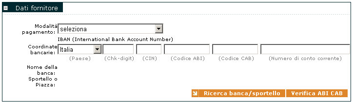 Compilando i campi obbligatori (Paese, ABI, CAB, Numero C/C) verra' visualizzato il nome della banca e dello sportello in modo automatico.